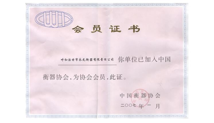 中國衡器協(xié)會(huì)會(huì)員證書
